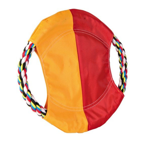 Frisbiee dysk nylonowy na bawełnianej obręczy ze sznura. Doskonale widoczny dzięki jaskrawym kolorom. Odkryte miejsca z mocnego sznura ułatwiają psu pochwycenie zabawki w locie. Doskonale nadaje się do aportowania oraz zabawy w przeciąganie.