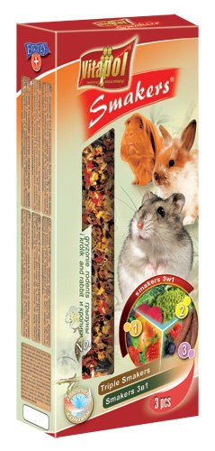 Doskonała, pełnowartościowa przekąska uzupełniająca dietę każdego gryzonia i królików. Zawiera zestaw trzech przysmaków w różnych smakach: owocowy, warzywny i świętojański, wyprodukowanych z najwyższej jakości mieszanki zbóż, wzbogaconych zestawem witamin. Smakowite kolby pomagają w ścieraniu wciąż narastających siekaczy, a naturalne, aromatyczne składniki gwarantują zdrowie i witalność.