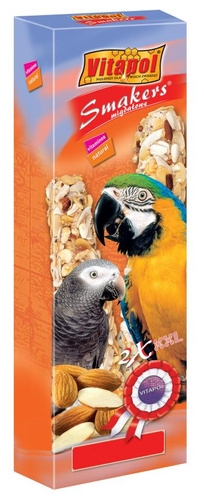 Doskonała, pełnowartościowa przekąska uzupełniająca ptasią dietę o smaku migdałów. Skład i wielkość XXL dostosowane specjalnie dla dużych gatunków papug (żako, ara, kakadu). Smakowita kolba pomaga w ścieraniu wciąż narastającej tkanki rogowej dziobów, a naturalne, aromatyczne składniki gwarantują zdrowie i witalność.