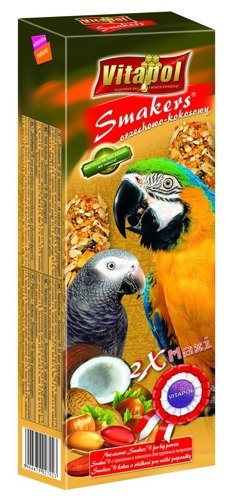 Doskonała, pełnowartościowa przekąska uzupełniająca ptasią dietę z orzechami i kokosem, wzbogacona zestawem naturalnych witamin. Skład i wielkość dostosowane specjalnie dla dużych gatunków papug (żako, ara, kakadu). Smakowita kolba pomaga w ścieraniu wciąż narastającej tkanki rogowej dziobów, a naturalne, aromatyczne składniki gwarantują zdrowie i witalność.