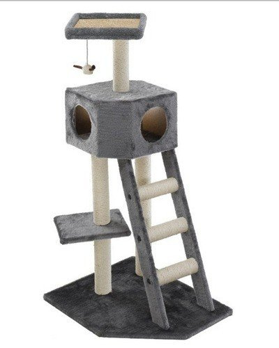 Przytulny domek obito zarówno wewnątrz jak i na zewnątrz (dno domku) wytrzymałym pluszem i umieszczono na grubych, wysokich słupach sizalowych. W domku znajdują się otwory do wskakiwania i wyskakiwania podczas zabawy. Z wysokości kot może wygodnie obserwować otoczenie. Umieszczona na szczycie drapaka zabawka zachęca do zabawy, a słupki owinięte sizalowym sznurem pozwolą zaspokoić potrzebę drapania i ścierania pazurków. Dodatkowo drapak wyposażono w drabinę z sizalowych schodków i podesty, które urozmaicają mebel i dodatkowo motywują do wspinaczki i gonitw.