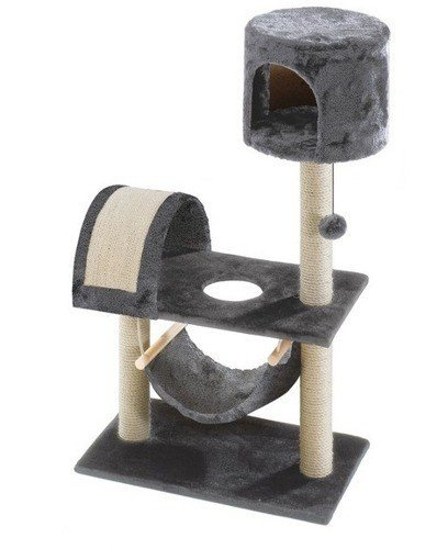 Przytulny domek na szczycie budowli obito zarówno wewnątrz (dno domku) jak i na zewnątrz mięciutkim w dotyku, ale wytrzymałym, grubym pluszem. Z wysokości kot może wygodnie obserwować otoczenie. Wisząca zabawka zachęca do zabawy, a słupki owinięte sizalowym sznurem pozwolą zaspokoić potrzebę drapania i ścierania pazurków. Również efektowny łuk pokryty sizalem doskonale nada się do drapania, a dodatkowo do przeciągania się. Drapak wyposażono w wygodny hamaczek, który chętnie zostanie wykorzystany na smaczną drzemkę po szalonej zabawie na drapaku.