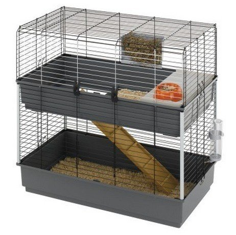 Klatka Rabbit 100 Double to prawdziwy dom dla Twojego pupila. Specjalnie zaprojektowana, aby zapewnić wygodę i komfort. Dwa piętra połączone są drewnianym podestem. Wykonana z materiałów najwyższej jakości, wytrzymałego, nietoksycznego i grubego, ale elastycznego plastiku, odpornego na kruszenie i pękanie. Na piętrze otwierany front klatki pozwala na łatwy dostęp do każdego jej zakamarka. Na parterze wmontowano bezpieczne dla zwierzątka, przesuwane drzwiczki, dzięki którym może ono swobodnie wychodzić i wchodzić, jeśli mu na to pozwolisz. W całości oddzielana kuweta (dno) powodują, że sprzątanie jest proste i wygodne. Klatka wykonana jest z powlekanych prętów. Kuweta (dno) jest wyjątkowo głębokie, aby zminimalizować rozsypywanie ściółki przez zwierzątko i zachować maksymalną czystość w otoczeniu klatki. To idealne miejsce do zabawy, jedzenia i odpoczynku dla świnek morskich, królików lub innych dużych zwierząt. Zapewnia komfortową przestrzeń i sporo miejsca na harce i wypoczynek.