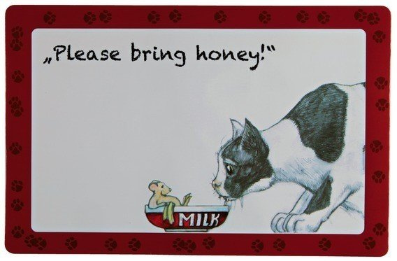 Wykonana z plastiku podkładka pod kocie miseczki, z zabawnym motywem kotka i myszki. Pozwala utrzymać czystość w miejscu spożywania przez kota posiłków.