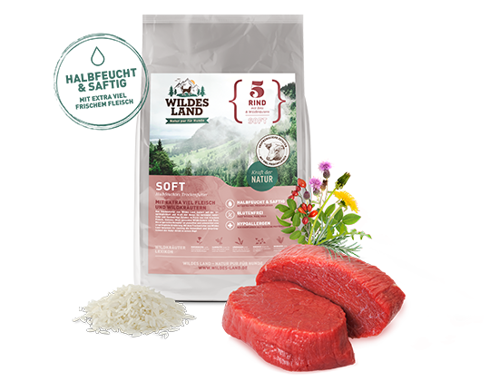 Karma Wildes Land Soft jest posiłkiem monobiałkowym - jedynym źródłem białka zwierzęcego jest tu świeże oraz suszone mięso wołowe. Dzięki temu nadaje się ona idealnie dla psów z wrażliwym przewodem pokarmowych oraz cierpiących na alergie pokarmowe. Karma jest lekkostrawna i nie zawiera glutenu, barwników, aromatów i konserwantów.